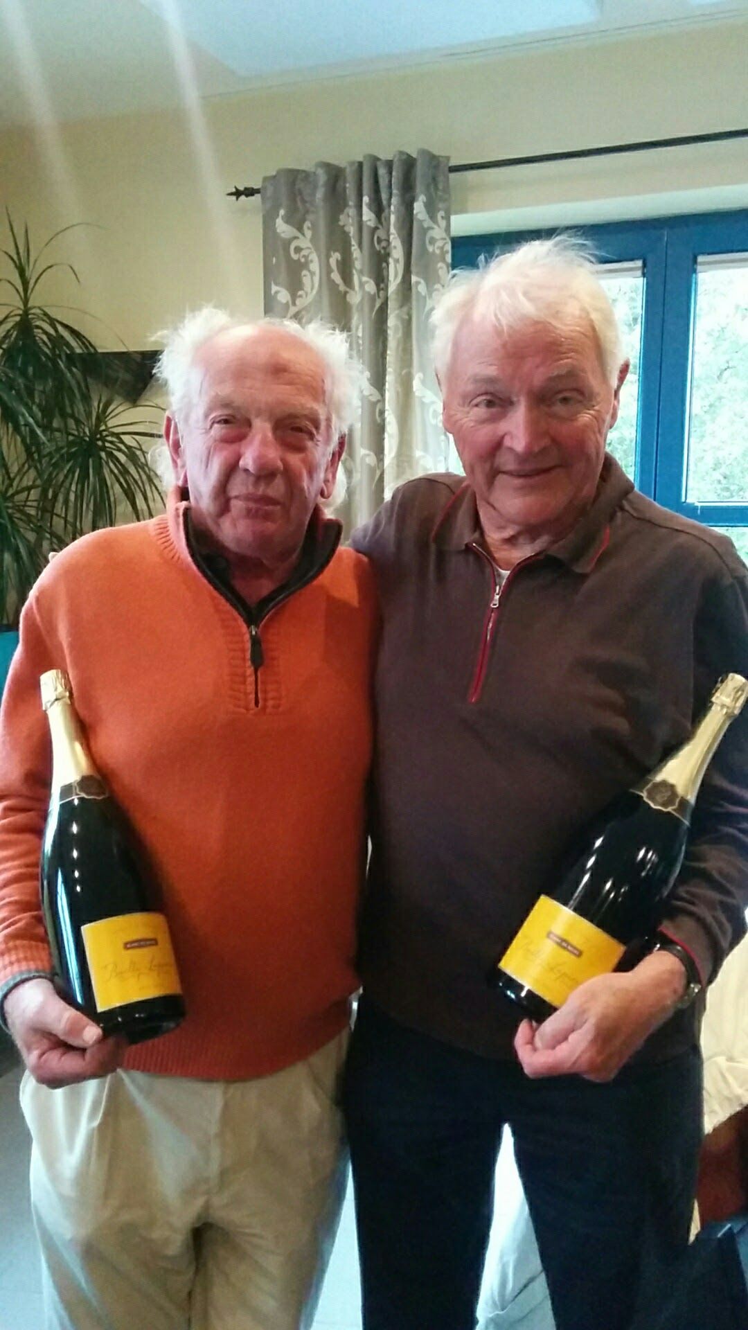 Für die drei Matchplay-Sieger gab es Cart-Gutscheine (Danke an Steve Anders) und Riesenflaschen Sekt. Dementsprechend gute Stimmung herrschte im Clubhaus, während draußen Sturmtief Xavier an den Clubfahnen rüttelte.